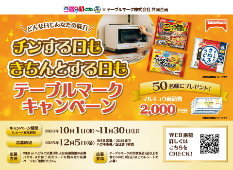 テーブルマークの冷凍食品1品以上を含む500円(税込)以上お買い上げのレシートでご応募ください。