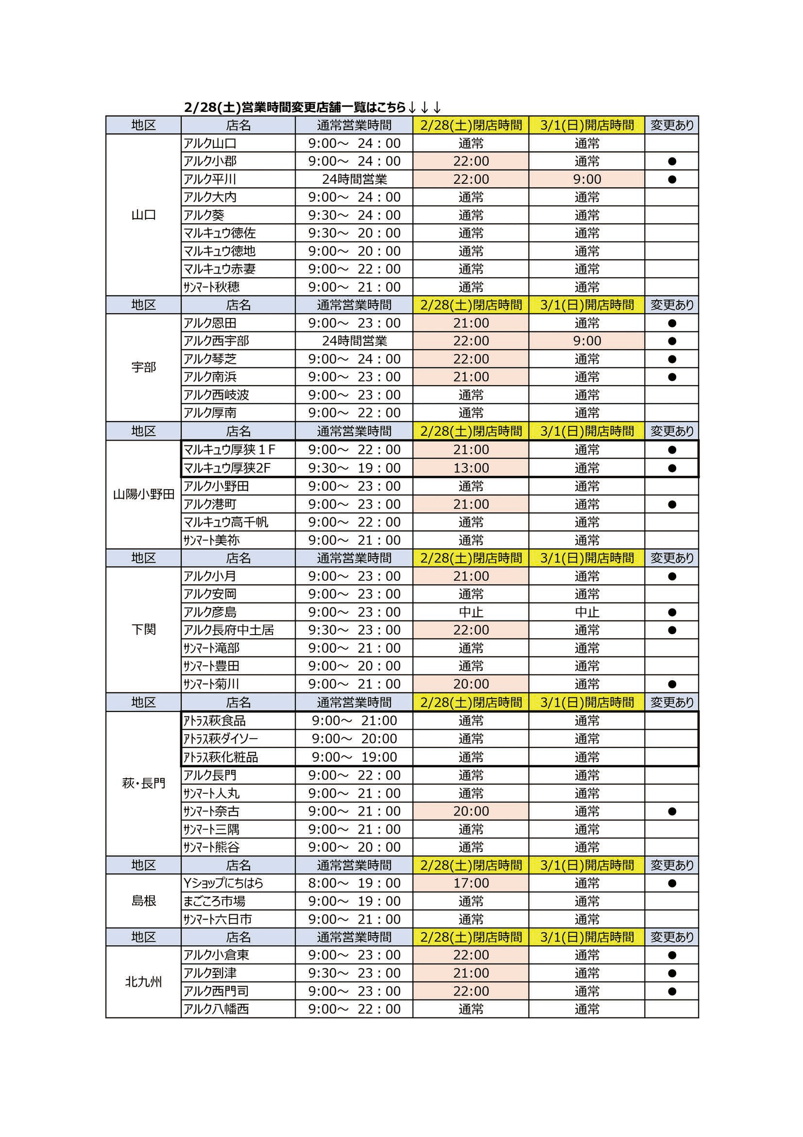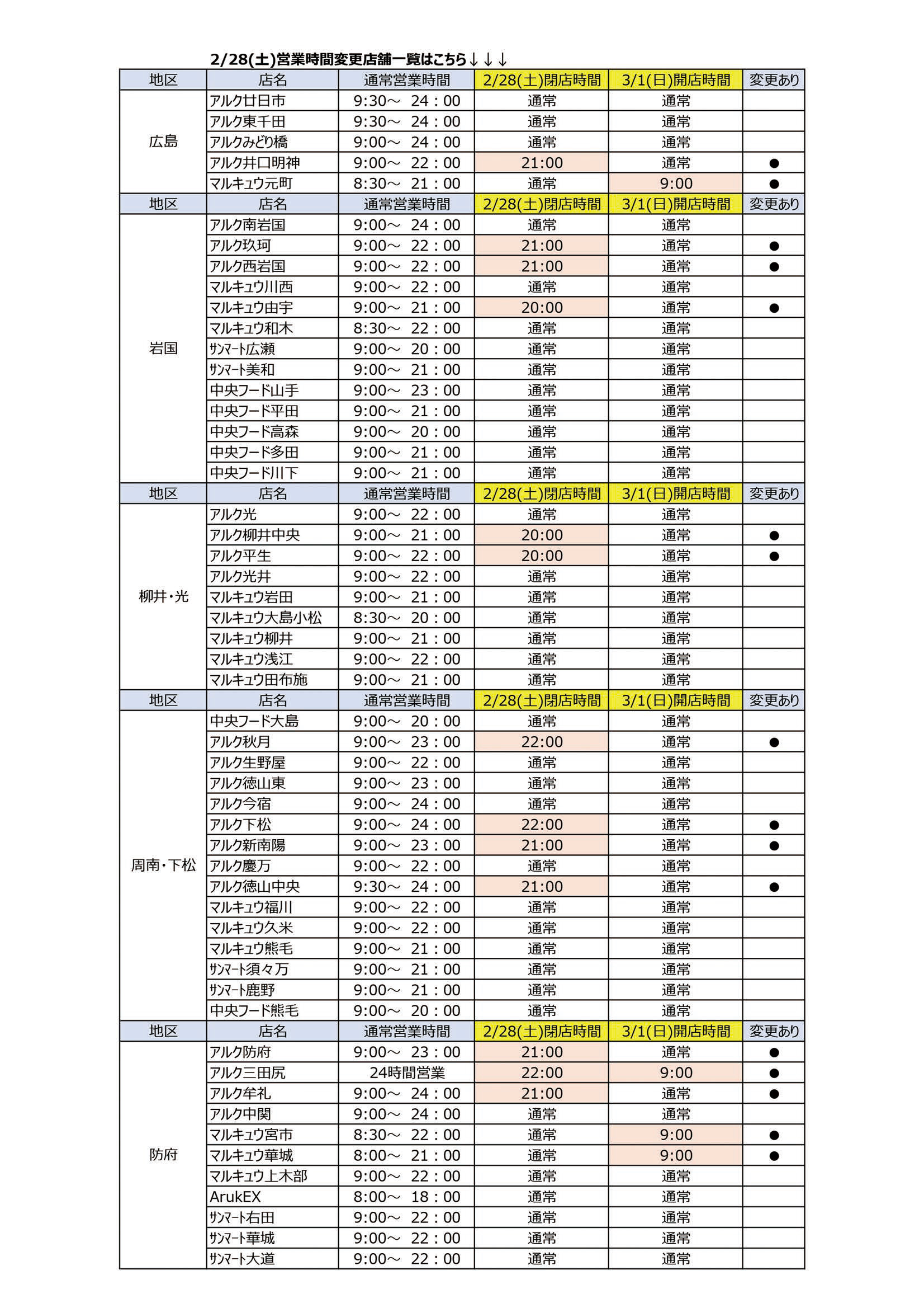 2月中は、棚卸のため一部店舗で営業時間を変更いたします。