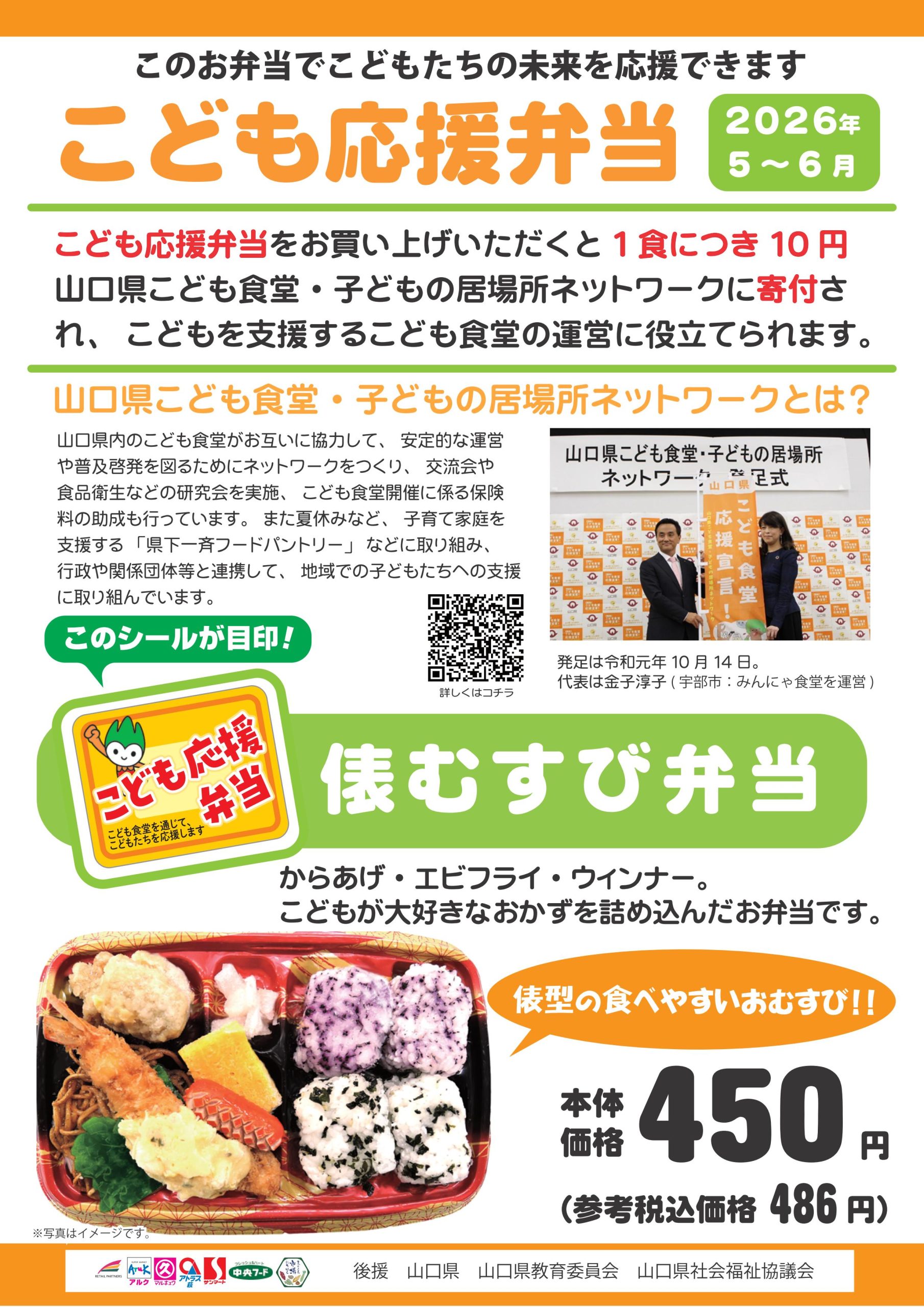 2026年5月1日から、「こども応援弁当」の対象商品が、「俵むすび弁当」に変更となります。2026年6月末までの2ヶ月間、こちらの商品を対象に、お買上げ1食につき10円が、山口こども食堂・子どもの居場所ネットワークへ寄付され、山口県こども食堂・子どもの居場所ネットワークに参加する県内のこども食堂が行う子どもたちを支援する活動にあてられます。