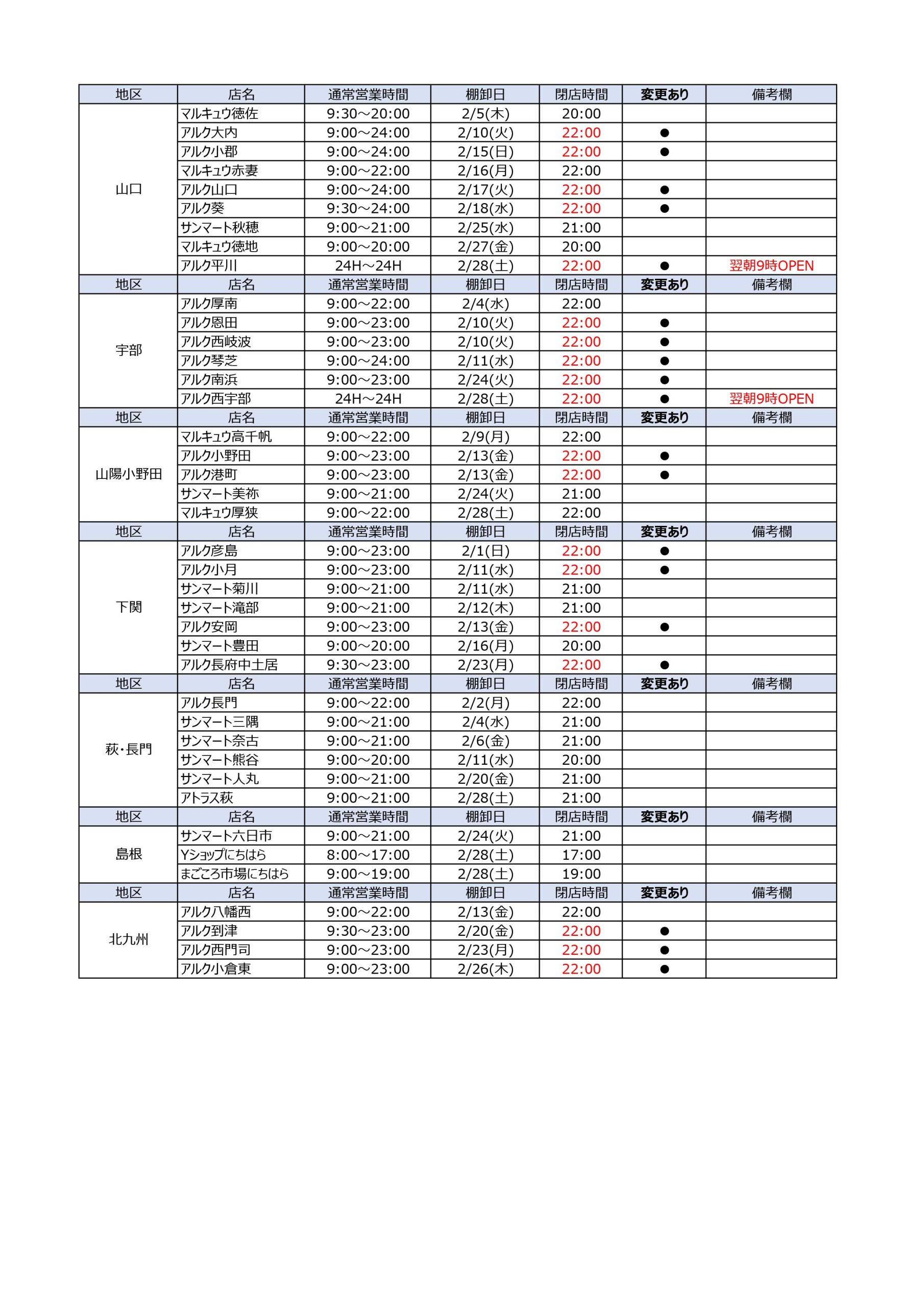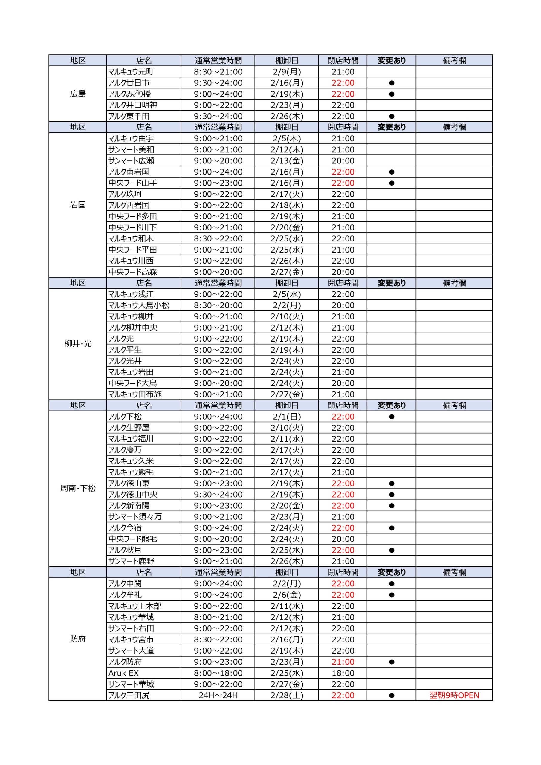 2月中は、棚卸のため一部店舗で営業時間を変更いたします。